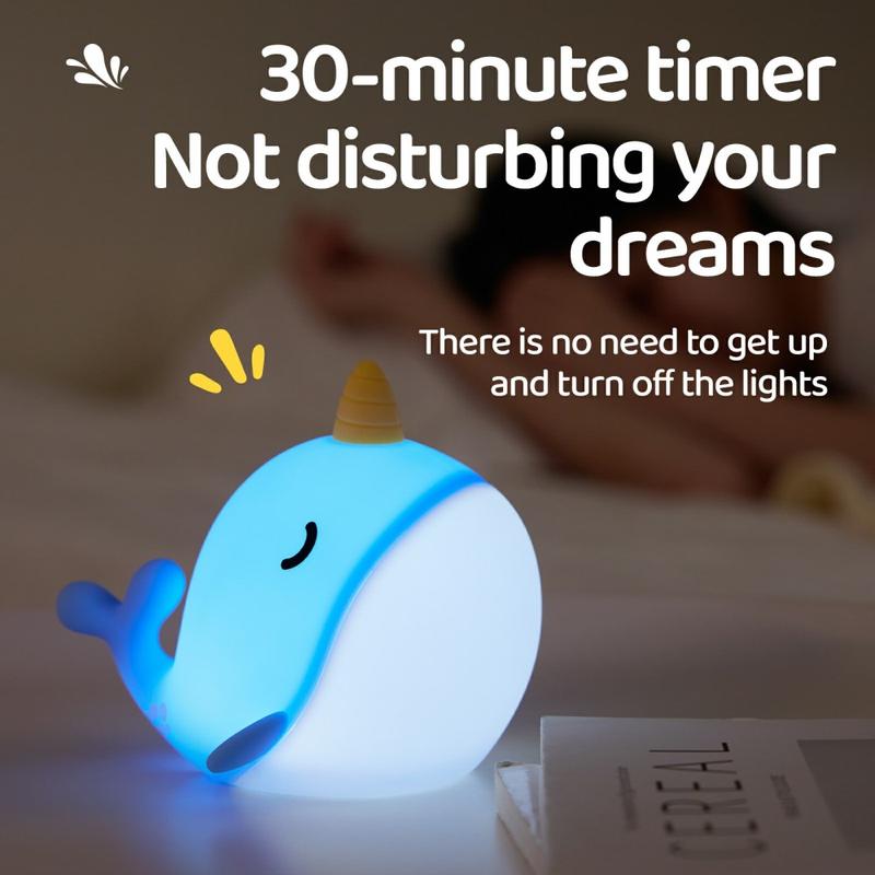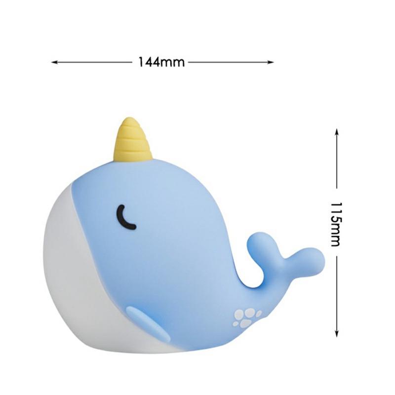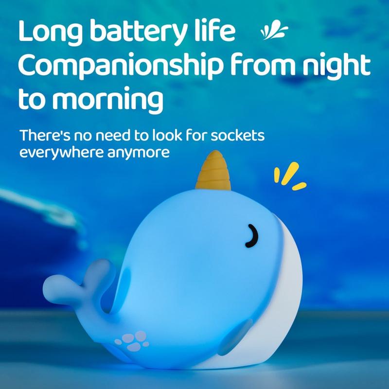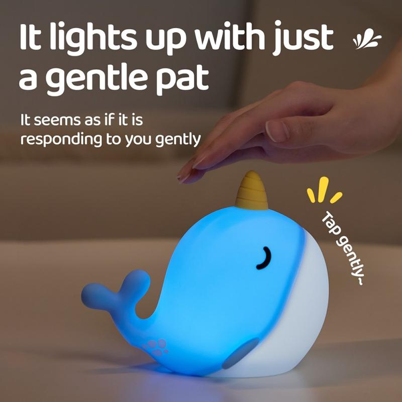 A044 Veilleuse en silicone Narwhal - Contrôle par tapotement, rechargeable par USB-C et douce lueur ambiante.