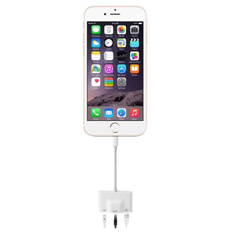 Cet adaptateur Lightning multifonctionnel 3-en-1 est doté d'un port Ethernet LAN RJ45, d'un port USB 2.0 et d'un port Lightning à 8 broches avec charge pass-through. L'adaptateur prend en charge la vitesse Internet de 10/100 Mbps et il est compatible avec tout iPhone et iPad Apple à 8 broches fonctionnant sous iOS 10 ou supérieur.