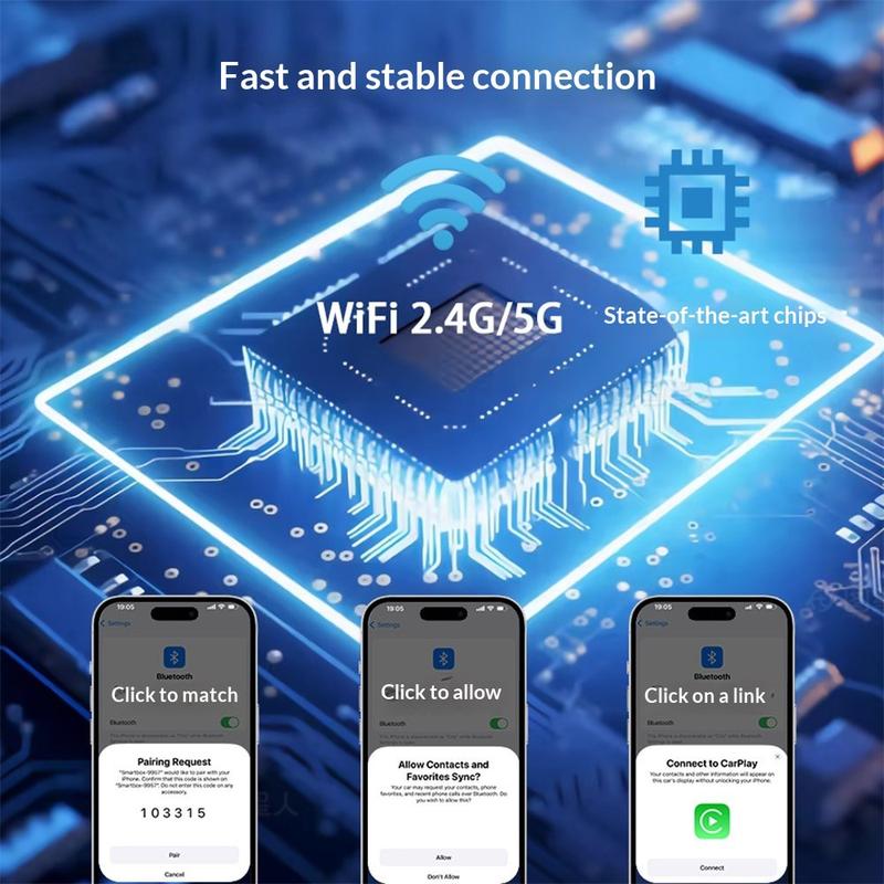 L'Ultra K15 prend en charge les appareils iPhone et Android figurant dans la liste de compatibilité, en utilisant le Bluetooth 5.2 et le Wi-Fi double bande 2,4 GHz/5 GHz pour la connexion sans fil. Selon les informations fournies, le couplage du téléphone s'effectue en 3 étapes, et l'adaptateur se reconnecte automatiquement dans les 5 à 15 secondes suivant le démarrage du véhicule. Cela permet de créer une routine plus pratique tout en gardant le tableau de bord plus propre et en réduisant l'encombrement des câbles.