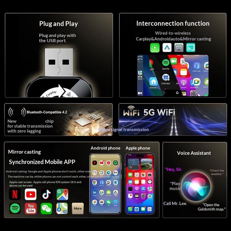 Grâce au Bluetooth 4.2 et au Wi-Fi double bande, il offre une connexion stable pour la navigation, la musique, les appels et l'utilisation de l'assistant vocal. Sa conception plug-and-play facilite l'installation, tandis que sa taille compacte permet de garder votre tableau de bord propre et bien rangé.