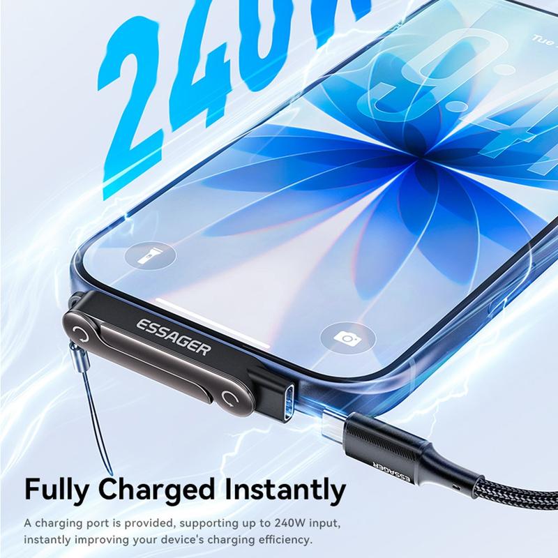 L'adaptateur ESSAGER USB-C femelle vers USB-C mâle est un accessoire 2-en-1 astucieux qui allie une connectivité haut débit à un support pliable pour téléphone. Conçu pour faciliter le quotidien, il prend en charge une charge pouvant atteindre 240 W et un transfert de données à 40 Gbps, tandis que sa conception en L à 90° permet d'obtenir un angle de câble plus confortable lors de l'utilisation. Compact, léger et facile à transporter, c'est une solution pratique pour le travail, les voyages et les configurations de recharge quotidiennes.