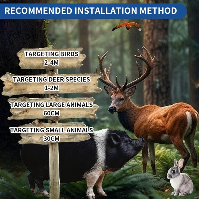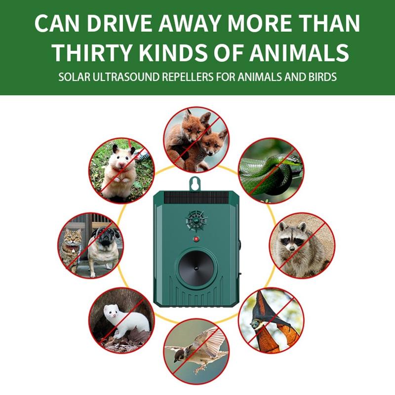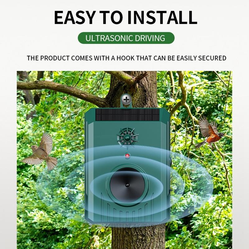 Combinant les ondes ultrasoniques (8-35KHz) et les sons audibles, l'appareil dissuade efficacement les oiseaux, les rongeurs, les chauves-souris, les chiens, les écureuils et d'autres animaux sauvages. La conception à double action augmente le taux de réussite de la répulsion sur un plus grand nombre de nuisibles.