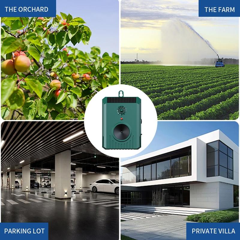 Idéal pour les jardins, les garages, les villas, les fermes, les parkings, les entrepôts et les espaces extérieurs en général. L'appareil offre une forte couverture pour les grandes zones qui ont besoin d'une dissuasion constante des nuisibles.