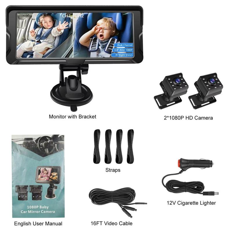 Le moniteur de voiture pour bébés à deux caméras de 6,8 pouces vous garantit une tranquillité d'esprit et une conduite plus sûre. Conçu avec deux caméras HD 1080P et un large écran de 6,8 pouces, ce système vous permet de surveiller simultanément deux enfants ou différentes zones du siège arrière. Doté de caméras pivotant sur 360°, d'une vision nocturne infrarouge améliorée et d'un large champ de vision de 150°, il offre une couverture fiable de jour comme de nuit. Facile à installer et doté d'un boîtier étanche durable, ce babyphone est le compagnon de sécurité idéal pour les familles.