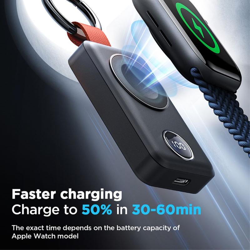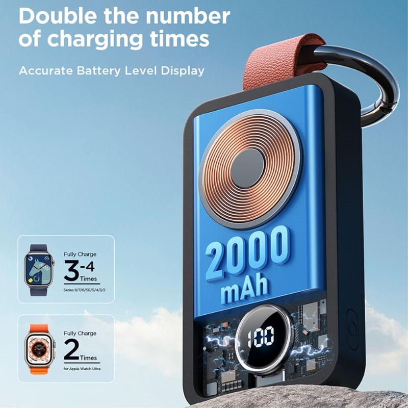 Gardez votre Apple Watch chargée où que vous soyez grâce au chargeur portable sans fil Joyroom JR-WQW01. Cette batterie externe compacte de 2000mAh est conçue comme un chargeur facile à accrocher à votre porte-clés et dispose d'un affichage numérique clair de la batterie, afin que vous sachiez toujours combien d'énergie il vous reste. Grâce à sa détection automatique et à son utilisation plug-and-play, il commence à charger rapidement sans configuration compliquée, ce qui le rend parfait pour les voyages, les journées de travail et les recharges d'urgence.