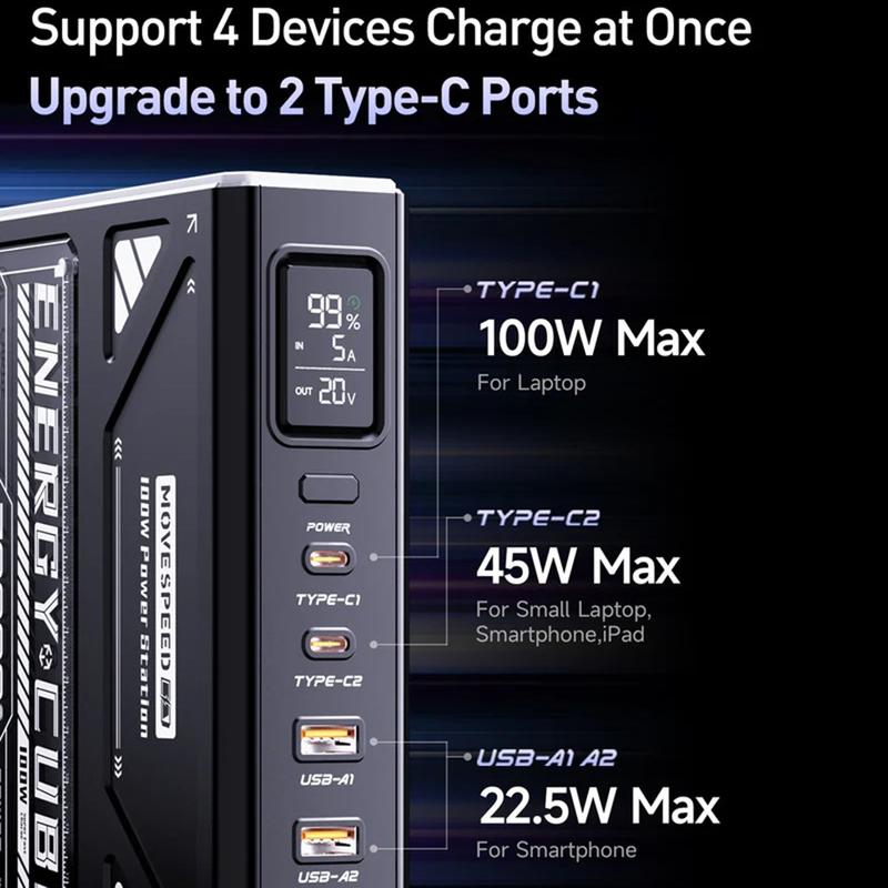 Gardez tous vos appareils alimentés pendant des jours avec le MOVESPEED YSPBZ70Pro-100 Power Bank, conçu pour une capacité et une performance sérieuses. Avec une énorme batterie de 70000mAh, une charge rapide de 100 W PD et un design robuste et portable, il est parfait pour les voyages, le travail en extérieur et la sauvegarde d'énergie en cas d'urgence.