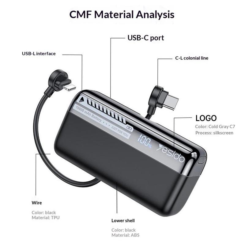Batterie externe Yesido YP99 de 10000mAh avec recharge rapide de 22,5 W, câble USB-C vers Lightning intégré et écran numérique