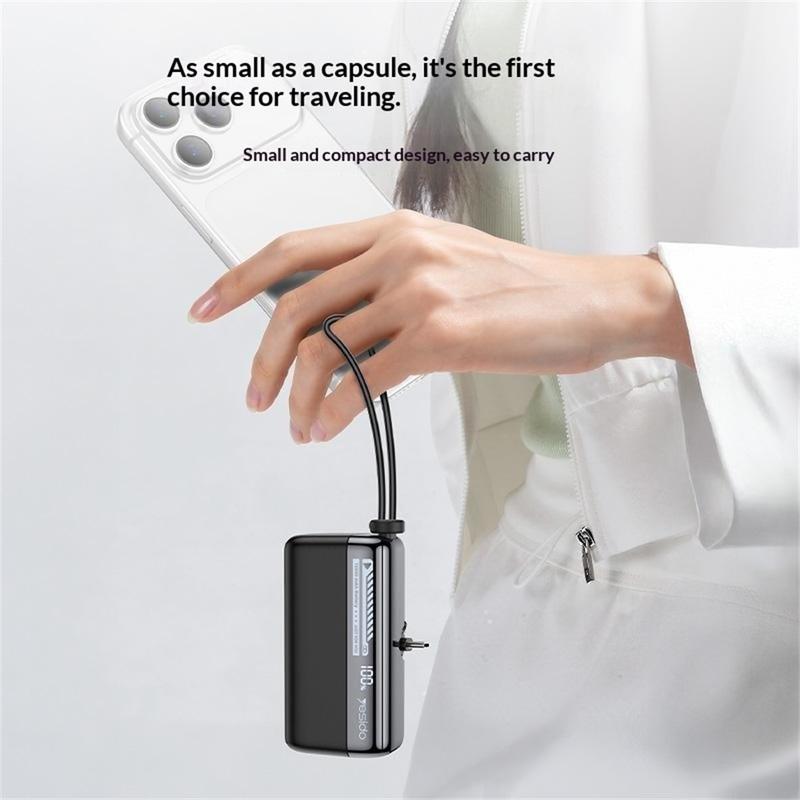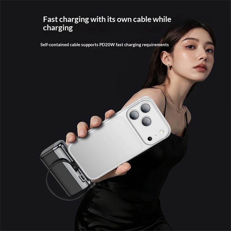 Le YESIDO YP99 comprend un câble USB-C vers Lightning intégré, vous évitant ainsi d'avoir à emporter un câble séparé. Le câble intégré de type lanière est doté d'une fiche pivotante à 90 degrés et peut également servir de support pour votre téléphone, vous permettant de le consulter en mode mains libres pendant la recharge. Cela rend cette batterie externe particulièrement pratique pour les trajets quotidiens, les voyages ou l'utilisation quotidienne, lorsque vous souhaitez limiter au maximum le nombre d'accessoires à emporter.