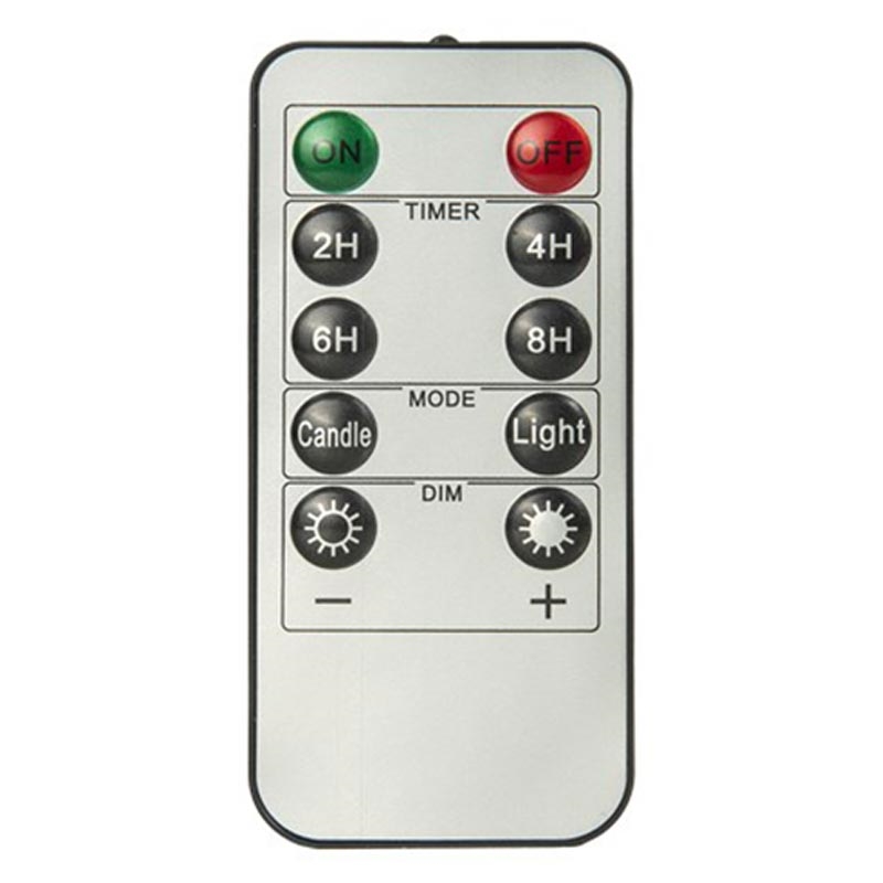 - Télécommande à 10 boutons permettant d'allumer et d'éteindre la bougie, de la faire vaciller, de la maintenir allumée et de la faire varier d'intensité.