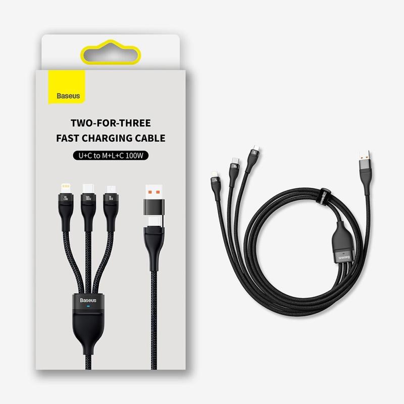 Chargez plus d'appareils avec moins de câbles grâce au câble de charge rapide 3 en 2 Baseus Flash Series. Ce câble multi-connecteurs intelligent dispose d'une double entrée (USB-A et USB-C) et de trois sorties (USB-C, Lightning et Micro USB) pour une large compatibilité avec les téléphones, tablettes, accessoires et bien plus encore. Les puces de reconnaissance intégrées permettent de répartir le courant et la tension en toute sécurité, tandis que les voyants LED indiquent l'état de la charge rapide en un coup d'œil. Sa gaine tressée en nylon durable et sa construction renforcée en font un câble fiable pour une utilisation quotidienne à la maison, au bureau, en voyage ou en voiture.