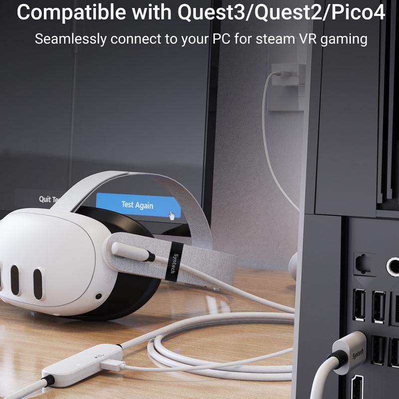 Jouez plus longtemps en réalité virtuelle sans vous soucier de l'épuisement de la batterie. Le Syntech M32C1-5 est un câble de liaison VR de 5m conçu pour Meta Quest 3S, Quest 3 et Quest 2, combinant des données USB 3.0 haut débit avec un port de chargement dédié de 18 W. Cela vous permet de maintenir une connexion filaire stable avec votre PC pour PCVR tout en rechargeant le casque, afin que vous puissiez rester dans le jeu pendant de longues sessions.
