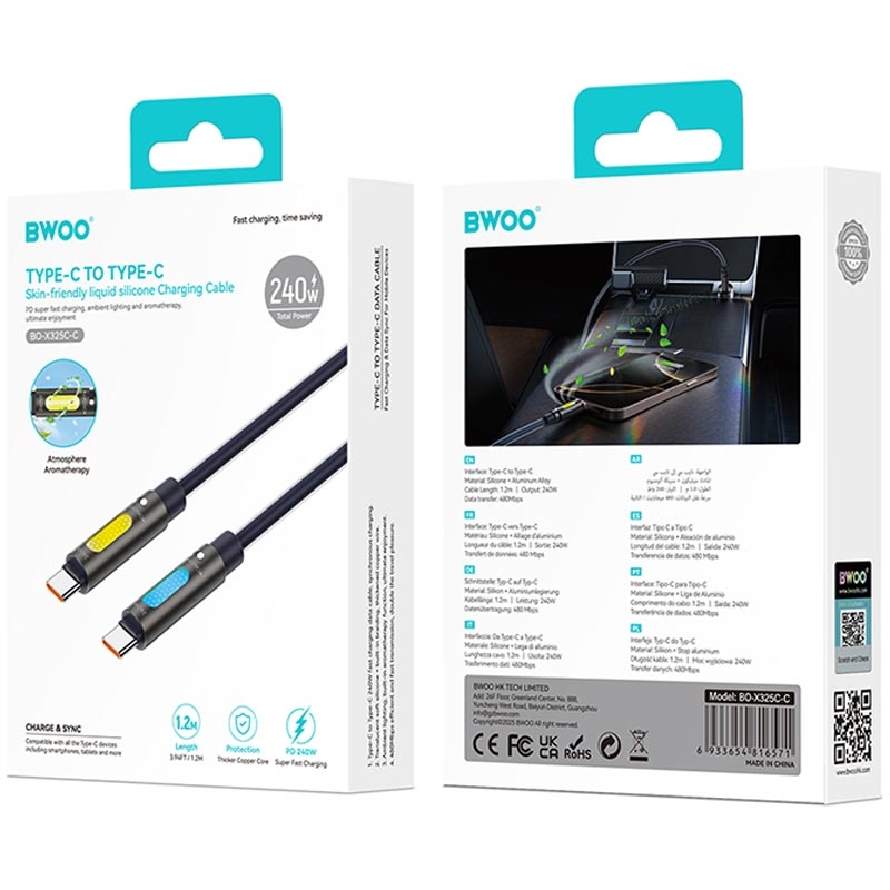 • Câble de recharge aromathérapie BWOO USB-C vers USB-C 240 W 1,2 m - Lumière RVB, silicone liquide, 480 Mbps