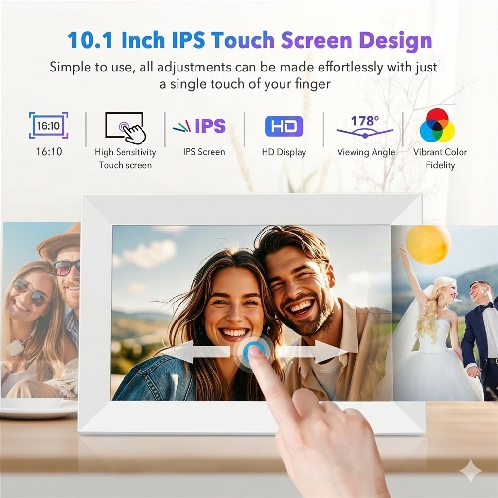 Profitez de vos souvenirs avec une clarté éclatante grâce à l'écran tactile IPS de 10.1 pouces offrant une résolution de 1280 × 800 et un angle de vision large de 178°. Parfait pour les photos, les vidéos et les diaporamas, avec des couleurs riches et un niveau de détail élevé.
