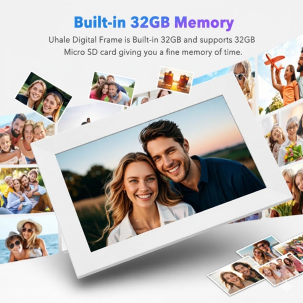 Le cadre comprend un espace de stockage interne de 32 Go, suffisant pour stocker des milliers de photos. Vous avez besoin de plus d'espace ? Insérez une carte Micro SD pour bénéficier d'un espace de stockage supplémentaire et d'une gestion aisée des fichiers.