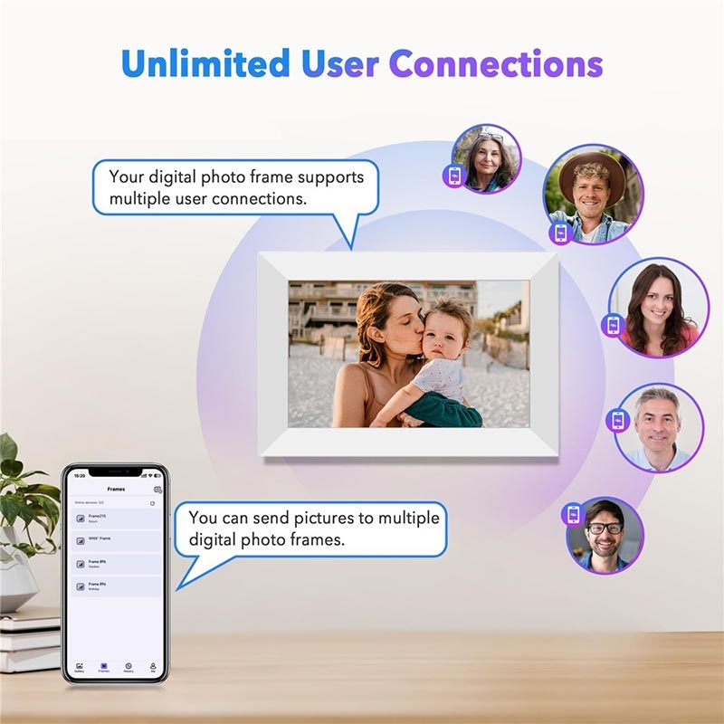 Grâce à l'application mobile fournie avec l'appareil, vous pouvez envoyer instantanément des photos ou des vidéos au cadre, où que vous soyez. La prise en charge de la synchronisation multi-appareils permet à plusieurs membres de la famille de partager des moments directement sur le cadre.