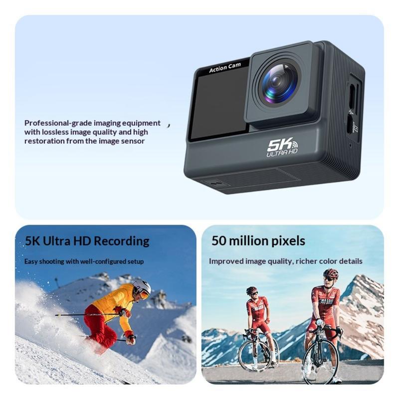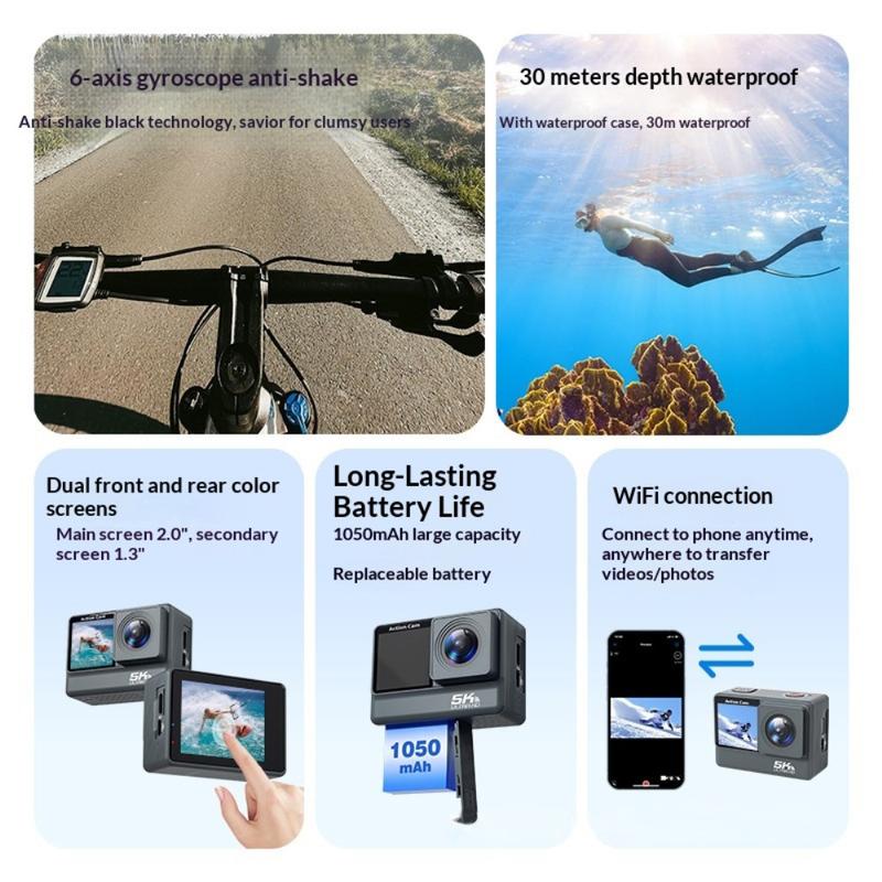 • Caméra d'action double écran F308AATR - Caméra sportive HD 5K avec stabilisation 6 axes, WiFi et boîtier étanche