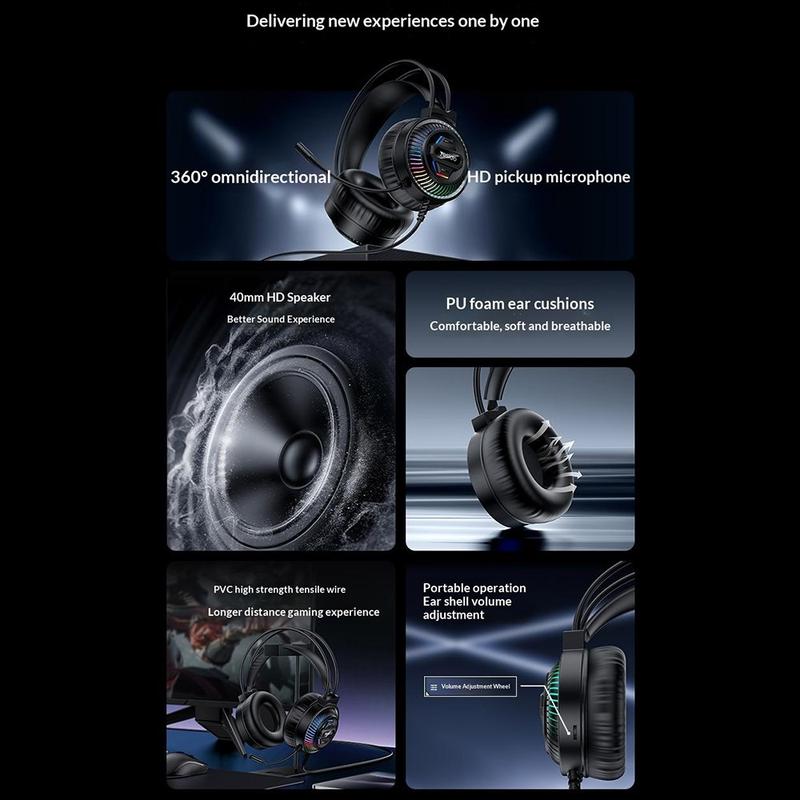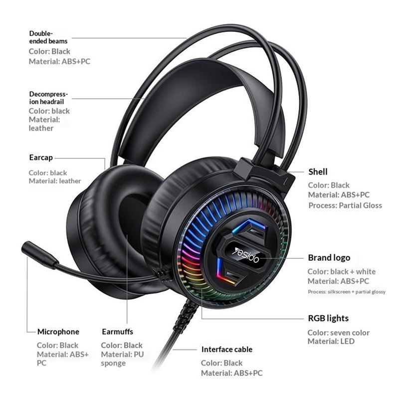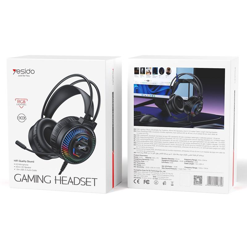 • Casque gaming filaire RGB Yesido EK06 avec haut-parleurs HD de 40 mm et microphone omnidirectionnel pour PC