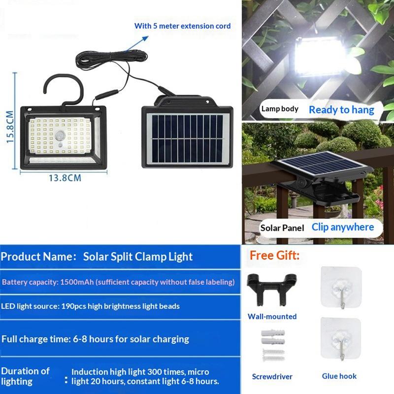 La lampe solaire à détecteur de mouvement CCP087 190 LED est une lampe d'extérieur étanche IP65 à conception séparée, dotée d'un éclairage puissant à cinq côtés, d'un détecteur de mouvement PIR, d'une recharge par panneau solaire et d'une recharge de secours de type C. Idéale pour les jardins, les garages, les balcons, les allées et le camping, elle offre une installation flexible et un éclairage extérieur pratique et économe en énergie.
