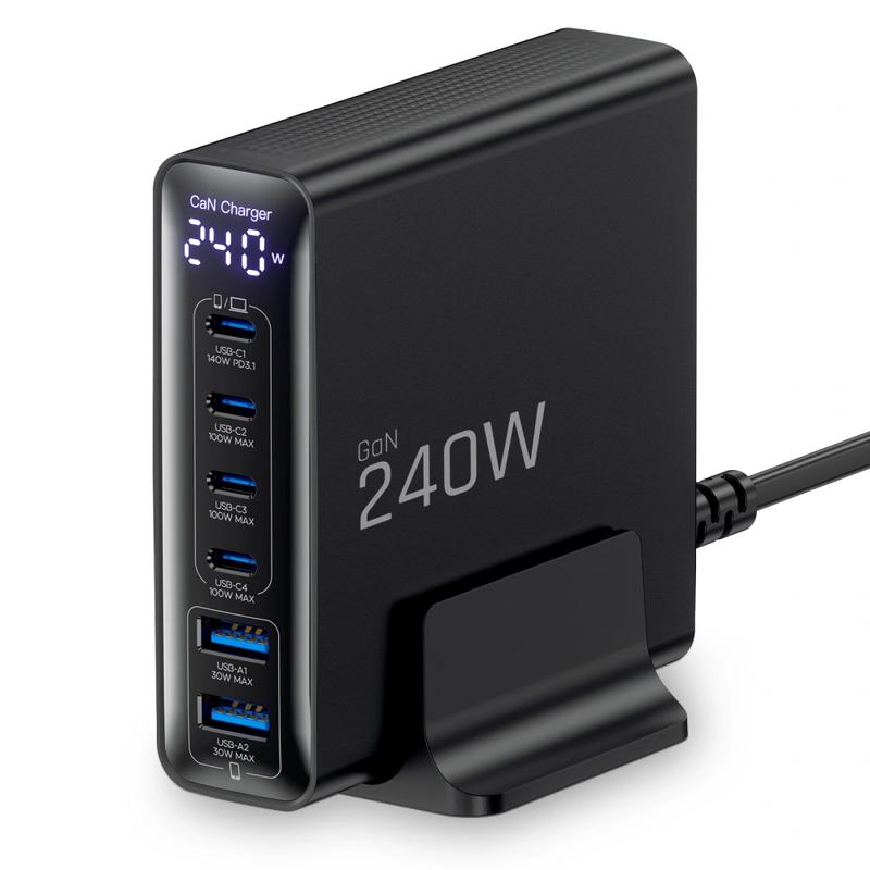 Chargeur de bureau Tech-Protect DC240W-GaN à 6 ports - 4xUSB-C, 2xUSB-A - Noir