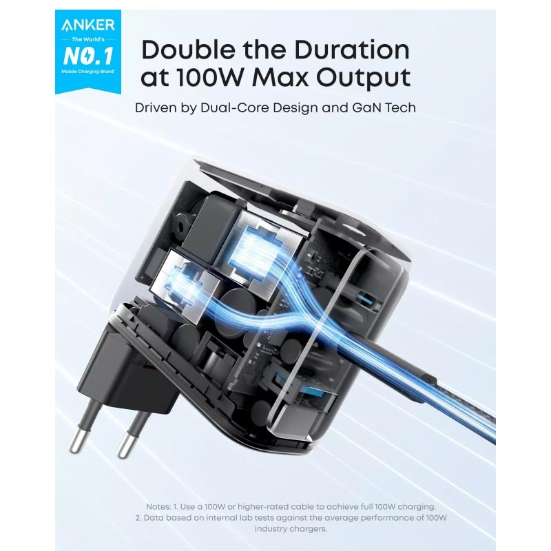 • Chargeur mural Anker 100W GaN avec écran intelligent et câble USB-C - Chargeur rapide à 2 ports USB-C et USB-A