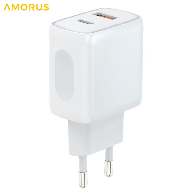 Le chargeur mural double port AMORUS combine une sortie USB-C PD (jusqu'à 20 W) et une sortie rapide USB-A (jusqu'à 18 W), vous permettant de charger deux appareils en même temps, ce qui est idéal pour les smartphones, les tablettes, les écouteurs, les batteries externes et bien plus encore.