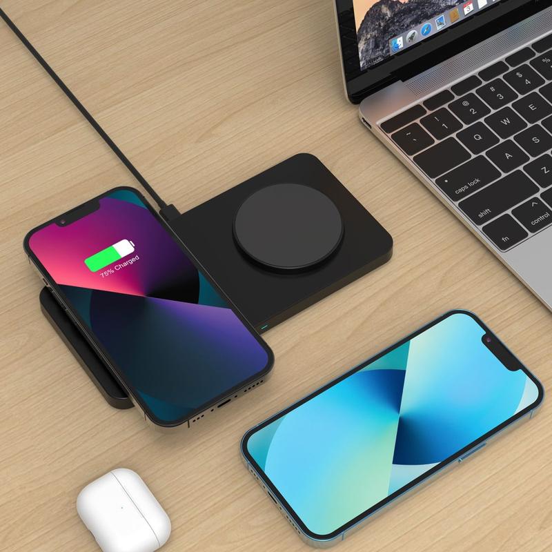 Simplifiez le chargement quotidien grâce au chargeur sans fil magnétique 2-en-1 M15 pour bureau. Conçu pour être placé sur un bureau ou une table de chevet, il vous permet de charger simultanément un téléphone et des écouteurs sans fil. L'alignement magnétique aide à maintenir les téléphones compatibles correctement positionnés pour un chargement plus stable, tandis que la base renforcée en silicone ajoute une adhérence pour éviter les glissements et protéger les surfaces des rayures.
