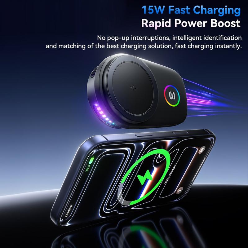 Gardez votre téléphone chargé, bien en vue et solidement fixé grâce au chargeur de voiture sans fil magnétique ESSAGER 15W. Conçu pour les conducteurs à la recherche d'une installation plus épurée et plus pratique, ce support pour grille d'aération combine une recharge sans fil rapide, une fixation magnétique puissante et un système de refroidissement actif dans un seul accessoire compact. L'éclairage RVB intégré apporte une touche de modernité, tandis que la rotation à 90° permet de passer facilement du mode portrait au mode paysage pour la navigation, les appels ou le contrôle de la musique.