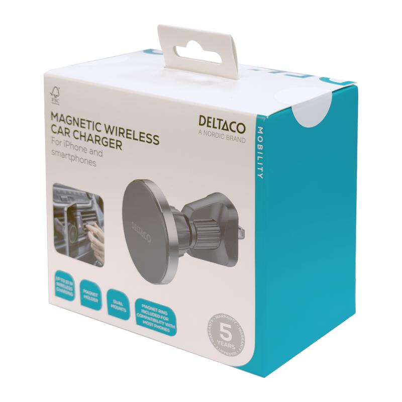 • Chargeur de voiture sans fil magnétique amovible Deltaco - Support pour téléphone Qi2 15W avec fixation pour grille d'aération et ventouse
