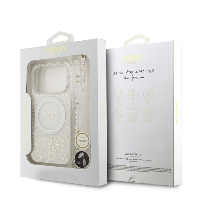 Coque iPhone 17 Pro Guess IML Flowers Allover avec bracelet en perles - Compatible MagSafe - Blanche