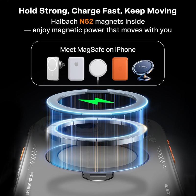 Doté de la technologie Halbach Array et d'aimants néodyme N52SH de première qualité, l'étui offre une force magnétique jusqu'à 200 % plus élevée. Cela garantit une fixation et un chargement fiables avec tous les accessoires MagSafe.