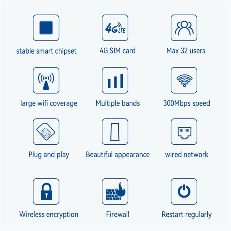 Transformez votre signal 4G en point d'accès Wi-Fi avec une portée de 20 à 30 mètres. Le routeur prend en charge jusqu'à 32 appareils simultanément, ce qui le rend idéal pour les ménages, les petits bureaux et les espaces partagés.