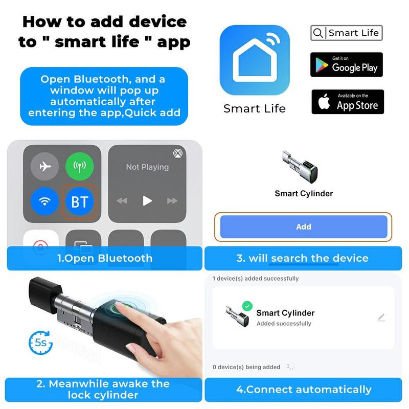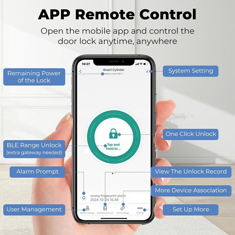 Ce cylindre de serrure intelligent prend en charge 5 méthodes de déverrouillage différentes, ce qui vous permet de choisir plus facilement l'option qui correspond à votre quotidien. Vous pouvez déverrouiller la porte via l'application, la reconnaissance d'empreintes digitales, la saisie d'un mot de passe, une carte à puce ou une clé traditionnelle. Cette flexibilité est particulièrement utile pour les foyers comptant plusieurs utilisateurs, l'accès des invités, les environnements de bureau ou toute personne souhaitant une alternative plus pratique au fait de devoir toujours avoir ses clés sur soi.