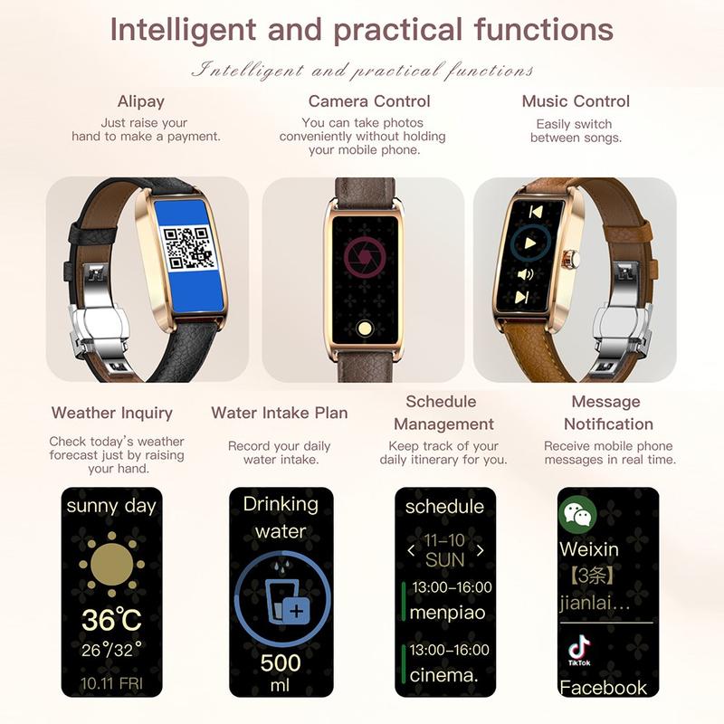 Restez organisé et connecté grâce à une gamme d'outils intelligents : Prise en charge d'Alipay, contrôle de la musique, caméra à distance, alertes par vibration, notifications de messages, mises à jour météorologiques, rappels d'hydratation et gestion de l'emploi du temps. Conçu spécialement pour les femmes, il inclut également le suivi du cycle menstruel et la réduction de l'intensité lumineuse de l'écran en mode nuit pour des soirées reposantes.