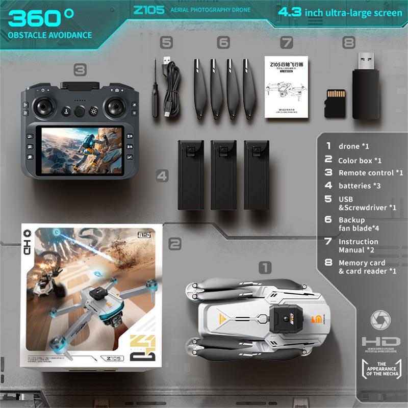 Le drone Z105 combine portabilité, innovation et performance dans un ensemble compact. Avec son écran de contrôle de 4.3 pouces, ses moteurs sans balais et ses fonctions de vol avancées, c'est l'outil ultime pour une photographie aérienne stable et sans effort et des expériences de vol immersives.