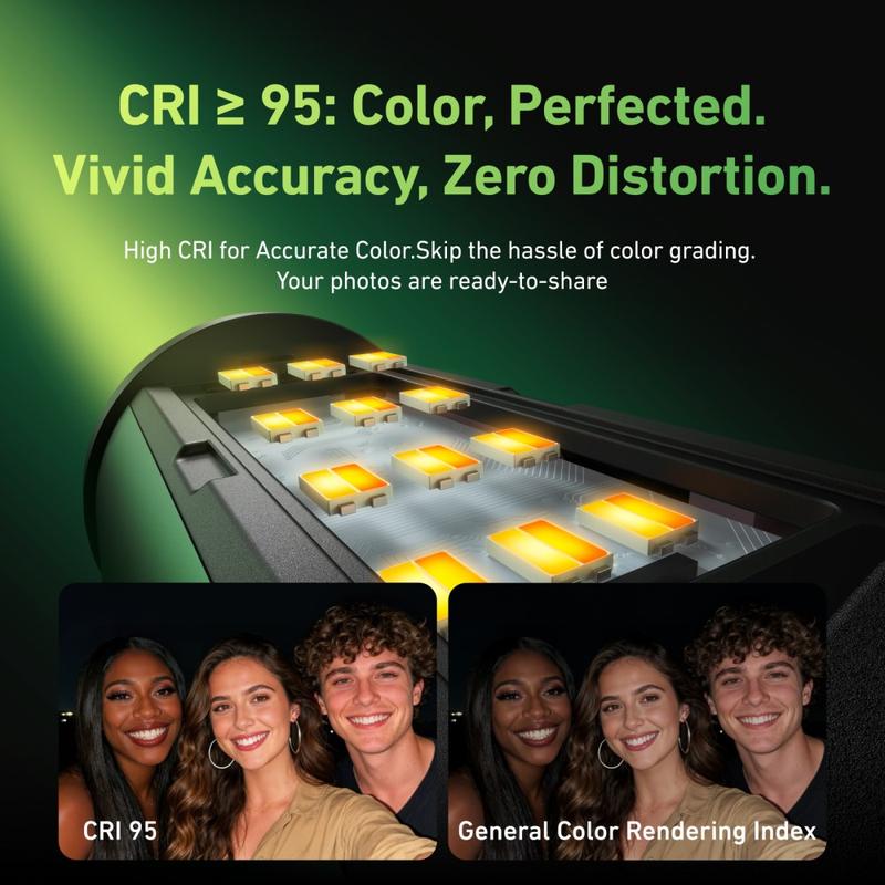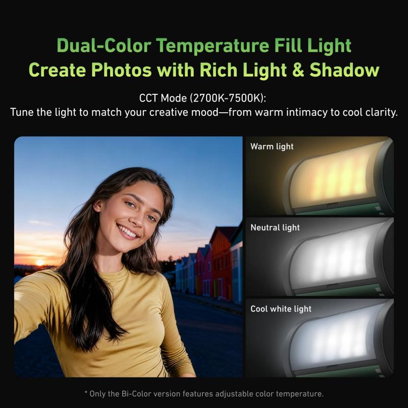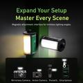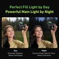 Son design inspiré des bobines de film rétro lui confère un look distinctif, tandis que la double température de couleur vous aide à adapter la lumière à différentes conditions de prise de vue. Utilisez-la comme lumière d'appoint plus douce en journée pour réduire les ombres ou comme source lumineuse plus puissante la nuit pour des images plus nettes dans des environnements sombres. Avec une plage de température de couleur de 2700K à 7500K et un IRC de 95 ou plus, la lampe produit des couleurs plus naturelles et réduit le besoin de correction des couleurs en post-production.