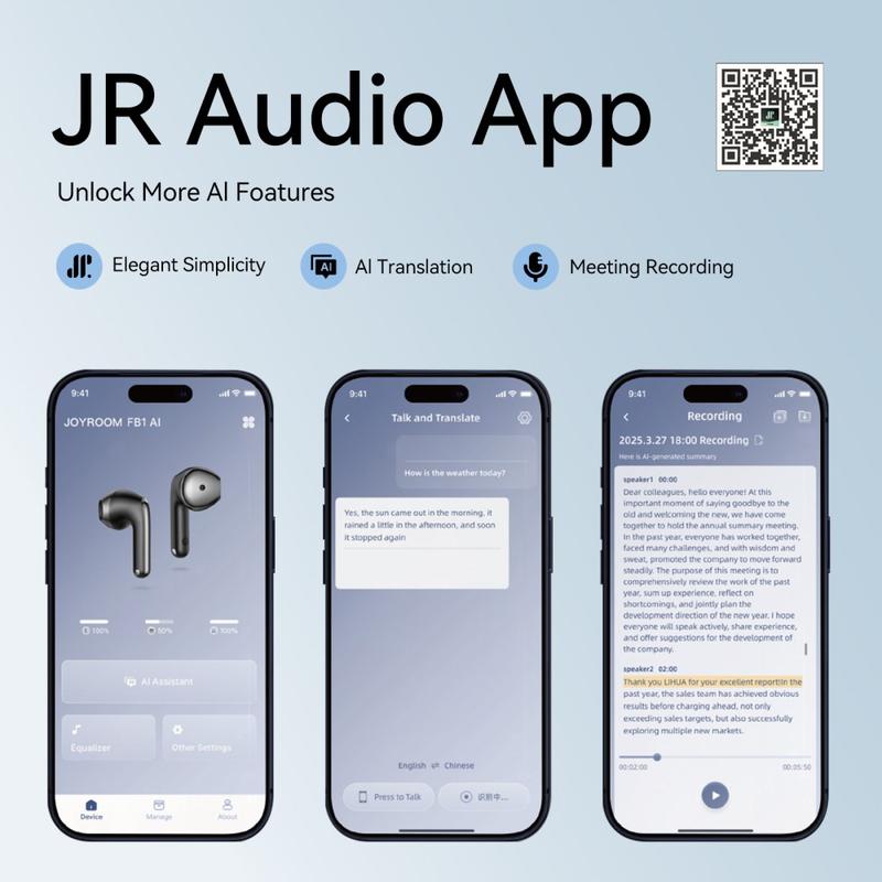 Passez du travail aux appels et aux jeux sans changer d'écouteurs. JOYROOM JR-FB1 combine un son sans fil véritable avec des fonctionnalités alimentées par l'IA conçues pour la productivité et le divertissement quotidiens. Utilisez le mode mono lorsque vous souhaitez rester attentif, ou portez les deux écouteurs pour profiter d'un son stéréo complet. La traduction en temps réel par IA, l'enregistrement des réunions et la génération de résumés par IA vous aident pendant vos voyages, vos études et vos journées de travail chargées, tandis que l'assistance vocale vous permet d'effectuer vos tâches en mode mains libres.