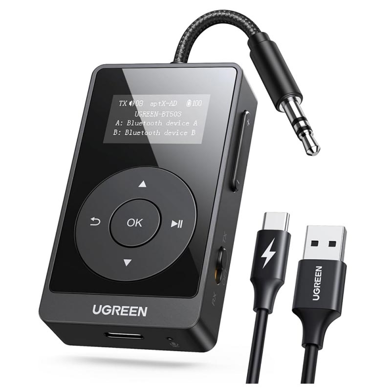 • Émetteur et récepteur Bluetooth 5.3 2-en-1 Ugreen BT503 - aptX Adaptive/HD (TX), écran LED, batterie jusqu'à 32 heures, prise AUX 3,5 mm, prise en charge de deux casques