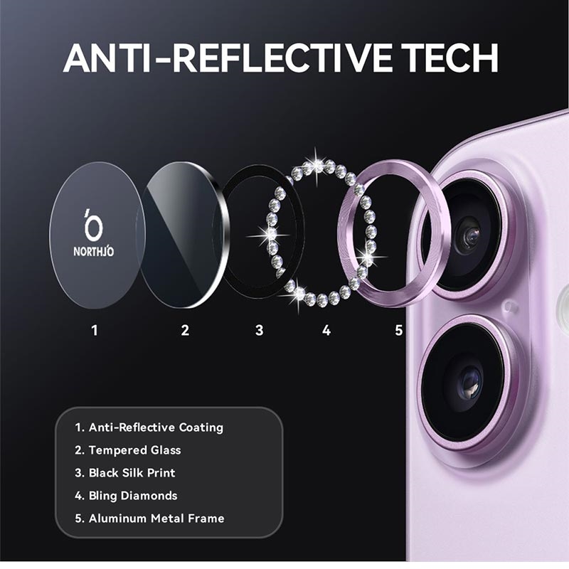 Ajoutez de l'éclat et de la protection à votre iPhone 17 avec la protection de l'objectif de l'appareil photo NORTHJO. Conçu avec des strass scintillants et un verre trempé taillé avec précision, il protège l'objectif de l'appareil photo des rayures, de la poussière et des chocs tout en ajoutant une touche d'élégance et de luxe.
