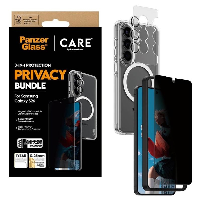 Protégez votre Samsung Galaxy S26 sous tous les angles et préservez la confidentialité du contenu de votre écran grâce au pack 3 en 1 Care by PanzerGlass Privacy. Conçu pour les trajets quotidiens, les voyages et la vie quotidienne trépidante, ce pack combine un protecteur d'écran latéral, un protecteur d'objectif d'appareil photo et un étui transparent résistant en un seul ensemble complet. Votre écran reste difficile à lire depuis les côtés, les objectifs de votre appareil photo sont protégés et votre téléphone bénéficie d'une protection efficace contre les chutes, le tout sans masquer le design de l'appareil.