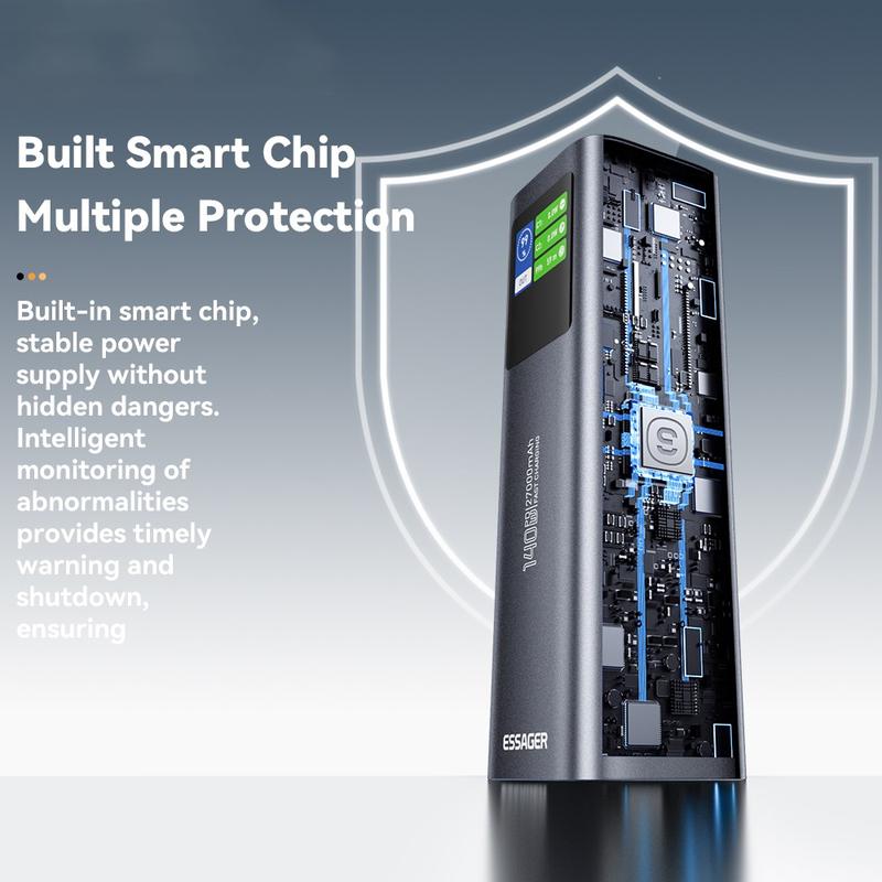 Le banc d'alimentation ESSAGER EDY140W offre une charge de 140 W pour ordinateur portable, une capacité énorme, une prise en charge simultanée de plusieurs appareils, une surveillance TFT en temps réel et une construction durable de qualité supérieure, idéale pour les utilisateurs intensifs, les voyageurs et les professionnels.