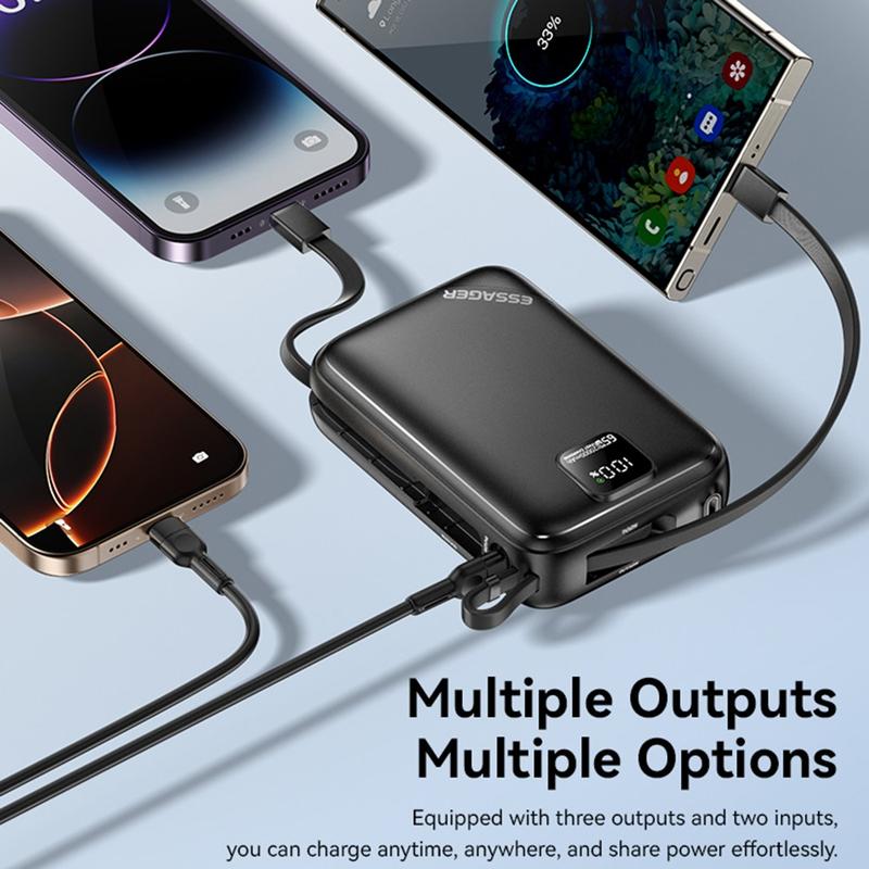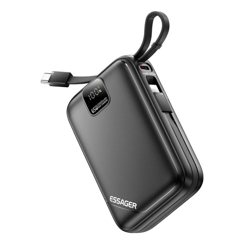 La banque d'alimentation ESSAGER 20000mAh délivre jusqu'à 65W Power Delivery, offrant une charge rapide de niveau ordinateur portable pour les smartphones, les tablettes, les ultrabooks et les appareils USB-C. Idéal pour les voyages, le travail et les urgences.
