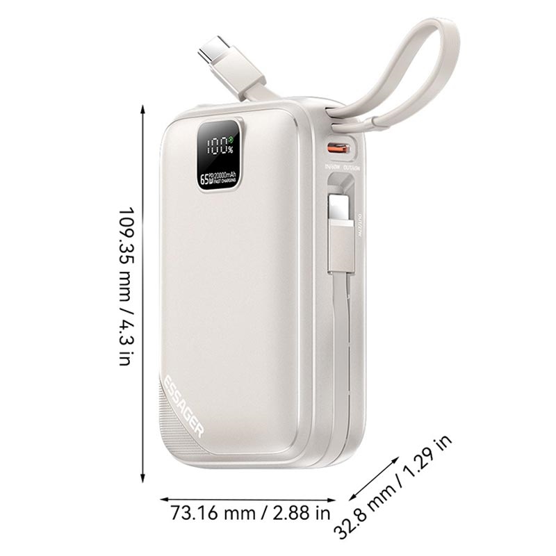 Essager 20000mAh PD 65W Batterie externe à charge rapide - Batterie externe portable avec écran LED, câbles Lightning et USB-C intégrés