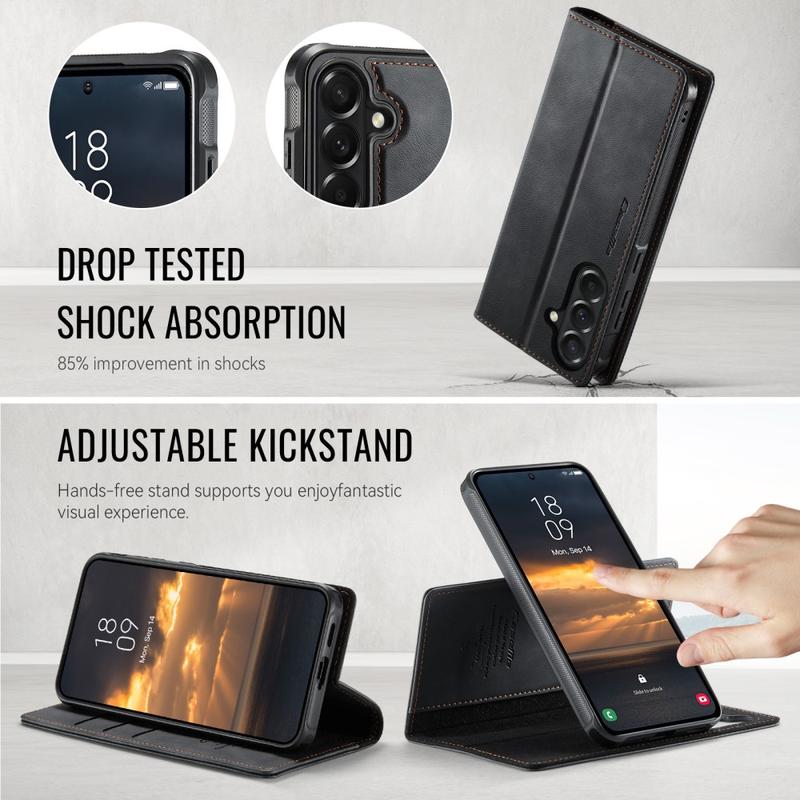 L'étui portefeuille CaseMe C49 pour Samsung Galaxy A57 est fabriqué à partir de TPU et de polyuréthane durables, offrant une prise en main confortable et une protection fiable contre les chocs, les chutes et les rayures au quotidien. À l'intérieur, une doublure en microfibre douce permet à votre appareil de rester impeccable.