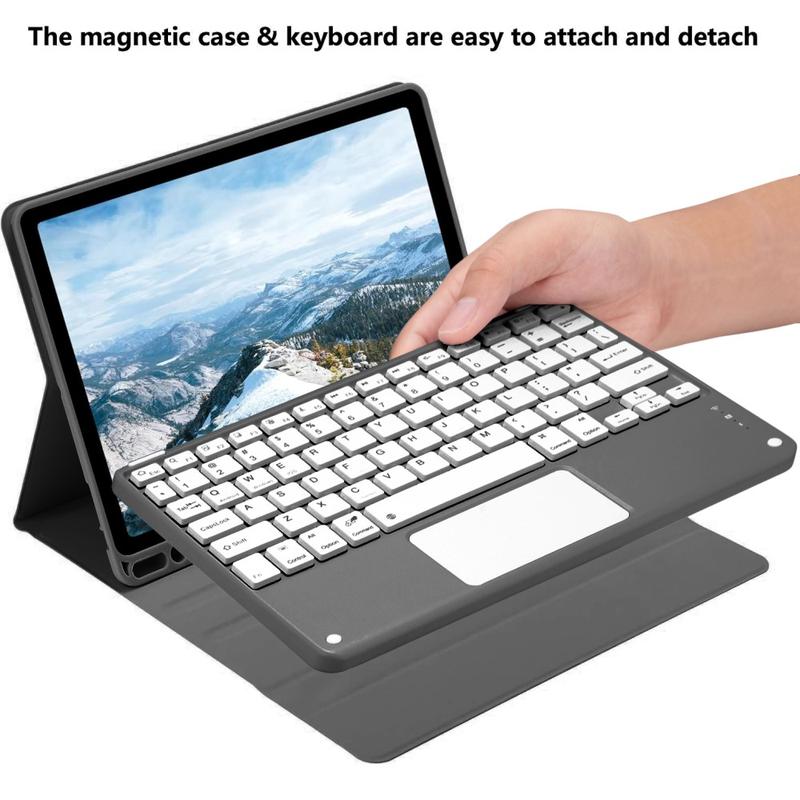 Améliorez votre iPad Air 11 2026/2025/2024, iPad Air 2022/2020 avec l'étui clavier Bluetooth, un accessoire 2-en-1 multifonctionnel qui allie protection, productivité et style. Fabriqué en polyuréthane de première qualité, cet étui élégant offre une protection complète contre les rayures, les chocs et les empreintes digitales, tout en conservant un aspect professionnel. Le clavier Bluetooth se connecte sans fil pour une frappe fluide et réactive, tandis que le pavé tactile intégré prend en charge le contrôle multi-gestes pour une navigation sans effort. Le clavier rétroéclairé vous permet de taper confortablement même dans des environnements peu éclairés. Le support réglable intégré offre un angle de vue ergonomique, ce qui le rend parfait pour la saisie, la lecture en continu ou la lecture. Conçu pour les affaires, les voyages ou l'usage quotidien, cet étui-clavier transforme votre tablette en station de travail portable.