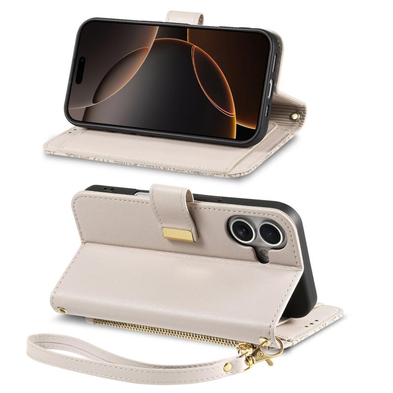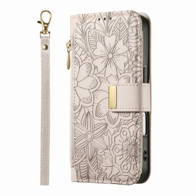 • Etui portefeuille à motifs floraux et de feuilles avec pochette zippée et dragonne pour iPhone 17