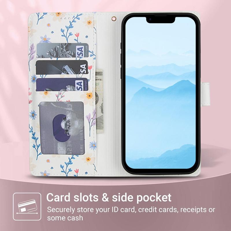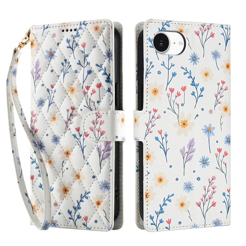 Étui portefeuille à motif floral rhombique pour iPhone 16e - avec dragonne et fentes pour cartes