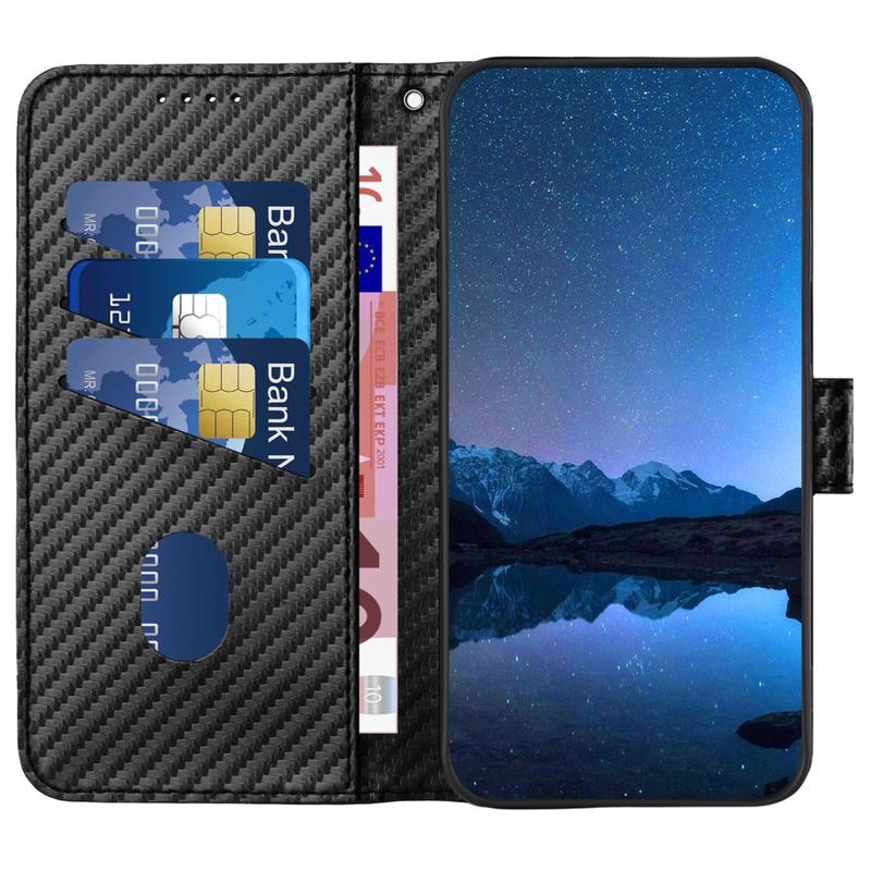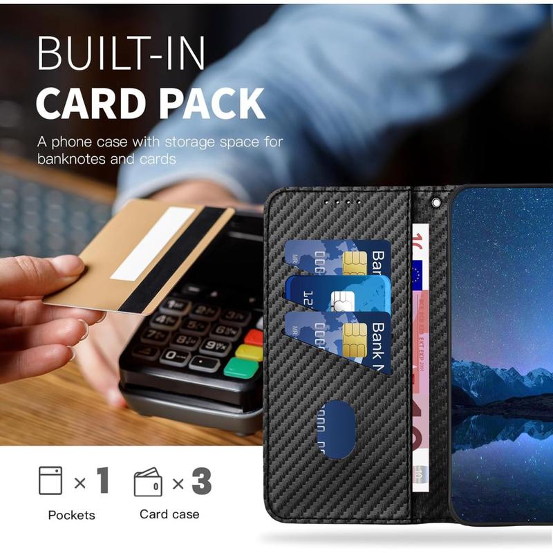 Cet étui portefeuille offre un design élégant, une protection fiable et une utilisation intelligente. La finition texturée en fibre de carbone ajoute un aspect moderne et professionnel, tandis que la couche intérieure en TPU absorbe les chocs en cas de chute accidentelle. Doté d'une fonctionnalité mains libres et d'une sangle amovible, il est conçu pour le confort et la polyvalence.