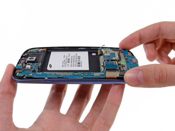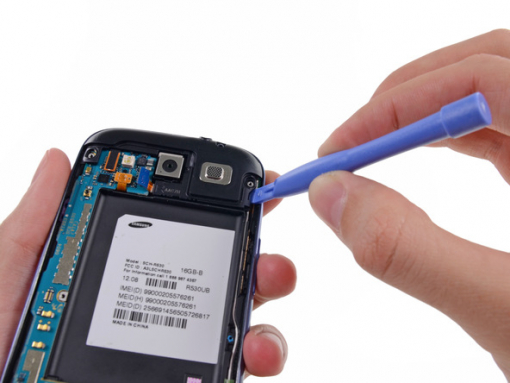 Insérer l'outil d'ouverture en plastique dans la petite encoche au-dessus de la batterie.