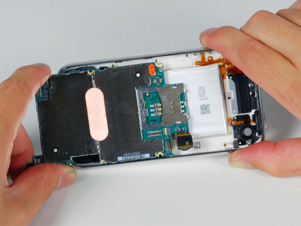 Il y a une petite languette de prise de terre dorée sur carte mère à côté de l'autocollant «Do not remove». Soyez TRÈS prudent qu'elle ne s'accroche pas sur le côté de la coque du téléphone lorsque vous soulevez la carte mère, car elle se casse facilement. Si vous avez des problèmes de signal après l'enlèvement de la carte mère, vérifiez cette languette de prise de terre.