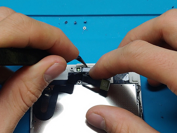 Hvis hele stikket vender sig opad uden at separere, skal du trykke kablet ned i toppen med den flade ende på en spudger. Samtidig skal du lirke den venstre side af stikket op. Vær forsigtig her, så du ikke kommer til at ødelægge kablet eller stikket, eller kommer til at frakoble sensoren permenent.